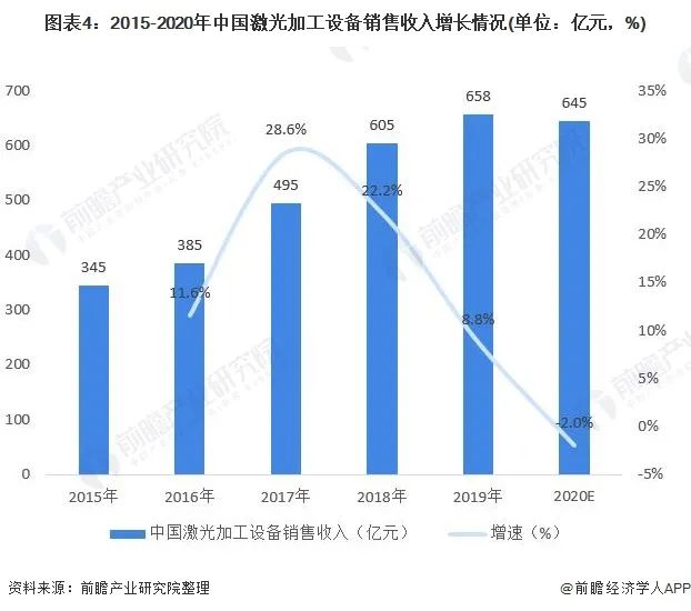 中國激光加工設(shè)備銷售收入約為全球的一半,2015-2020年中國激光加工設(shè)備銷售收入持續(xù)增長,2019年達658億元,2020年初步估計達到645億元。