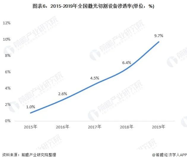 相對于國際激光設(shè)備制造與應(yīng)用,我國激光切割設(shè)備滲透率較低,歐美發(fā)達國家已經(jīng)步入“光加工”時代,我國激光加工設(shè)備應(yīng)用滲透率相對國際水平較低,2019年我國激光切割設(shè)備銷量僅為金屬削機床銷量的9.7%,不到10%,占比較低。