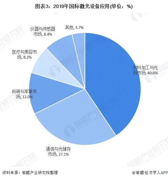 國際激光設(shè)備應(yīng)用較為多元化,包括材料加工與光刻市場、通信與光儲存市場、科研與軍事市場、醫(yī)療與美容市場、儀器與傳感器市場等,其中,材料加工與光刻市場占比最高,達40.6%;其次為通信與光儲存市場,占比為27.1%。