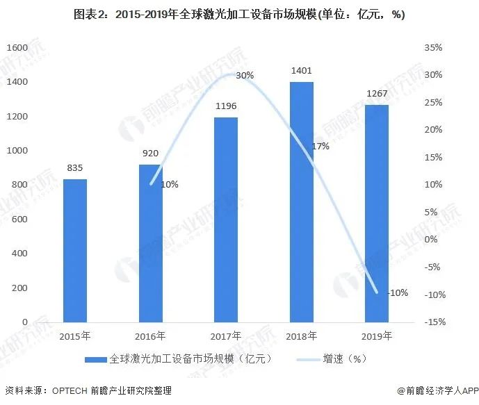 全球激光加工設(shè)備市場規(guī)模超過千億元,2019年達到1267億元,同比下降10%。