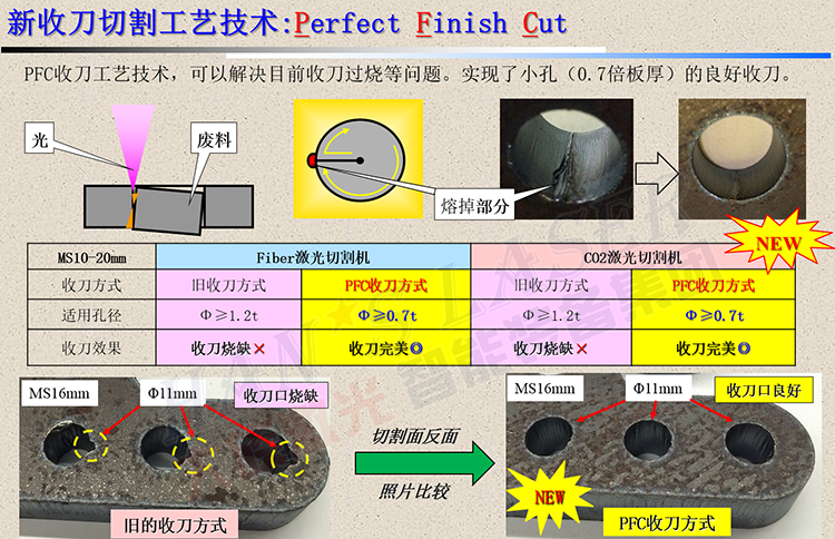 碳鋼厚板切割時,在收刀處經(jīng)常出現(xiàn)過熔現(xiàn)象,嚴(yán)重影響工件品質(zhì),對精密要求高的客戶來說決不容許的。PFC收刀工藝技術(shù),可以解決目前收刀過燒等問題。實現(xiàn)了小孔(0.7倍板厚)的良好收刀。
