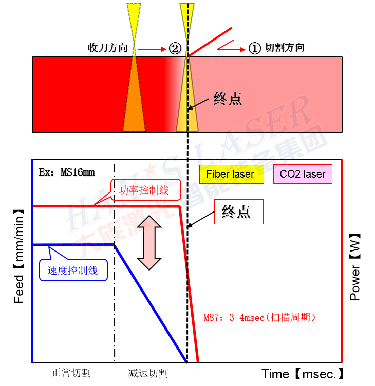 原因是切割部分發(fā)生的熱會比切割速度更快地向前傳達(dá),比光束先行的熱在到收刀口附近,由于熱傳導(dǎo)的關(guān)系,收刀口處的熱沒地方擴(kuò)散,處于高溫狀態(tài)。這時輔助氣體氧氣的供給會使收刀口激烈燃燒以致燒缺。