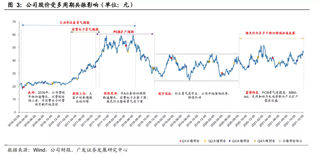 從歷史趨勢來看,公司業(yè)務(wù)受到下游周期性影響。復(fù)盤公司歷史業(yè)績,公司整體收入呈現(xiàn)典型的多周期共振特點(diǎn),受到宏觀驅(qū)動(dòng)的激光設(shè)備周期、PCB產(chǎn)業(yè)擴(kuò)產(chǎn)周期、大客戶新產(chǎn)品周期以及新興產(chǎn)業(yè)擴(kuò)產(chǎn)周期影響。