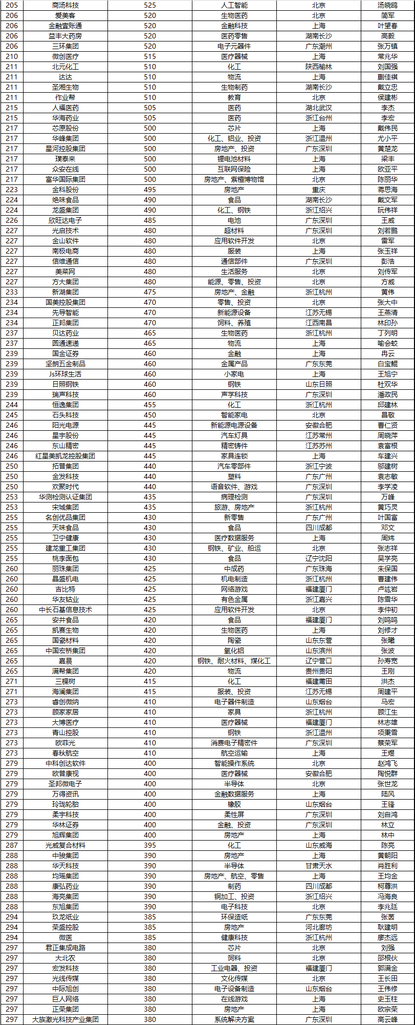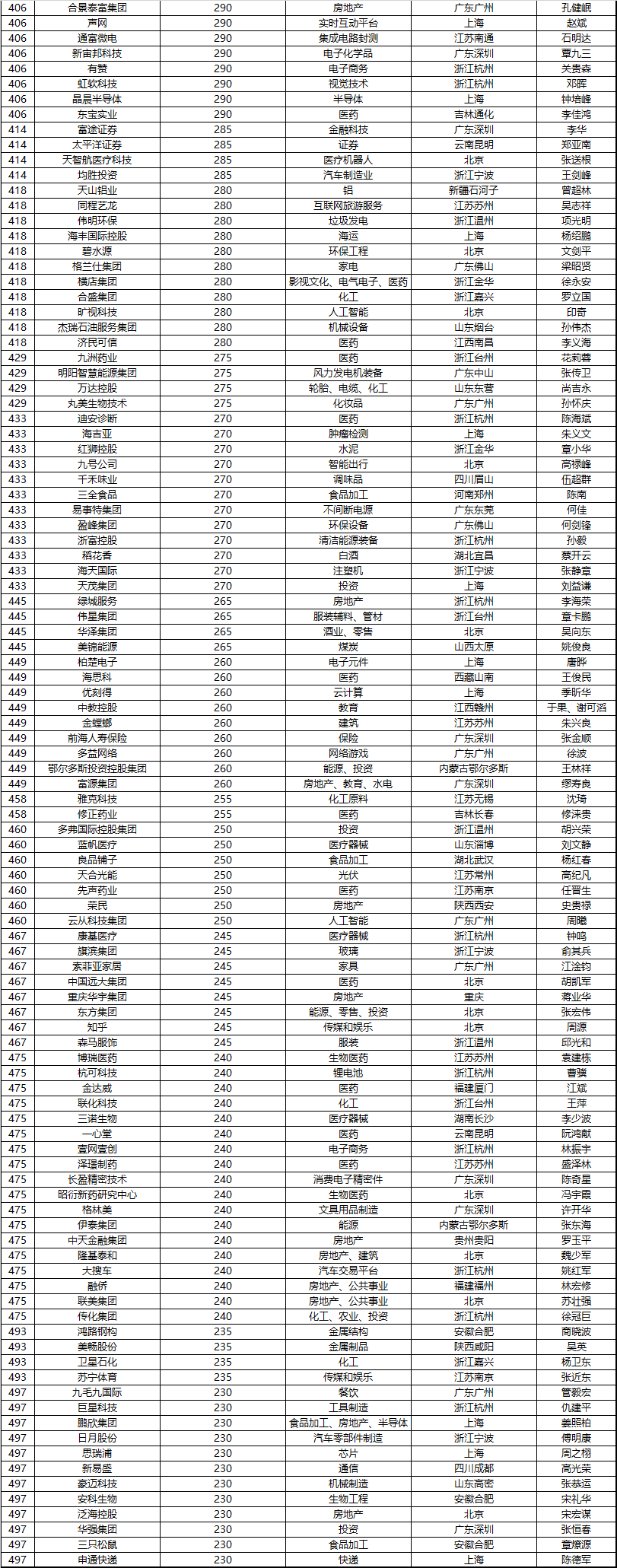 500強(qiáng)民營企業(yè)去年銷售額總和22萬億元,是去年中國GDP的五分之一,超過英國一年的GDP;共擁有員工970萬人。胡潤表示:“要上中國500強(qiáng)榜單并不容易,今年門檻比去年高了90億元,達(dá)到230億元,但仍然有120家企業(yè)新上榜,500強(qiáng)的平均價(jià)值比去年增長了55%,達(dá)到1100億元。上榜企業(yè)在各個(gè)領(lǐng)域已經(jīng)達(dá)到世界級。”