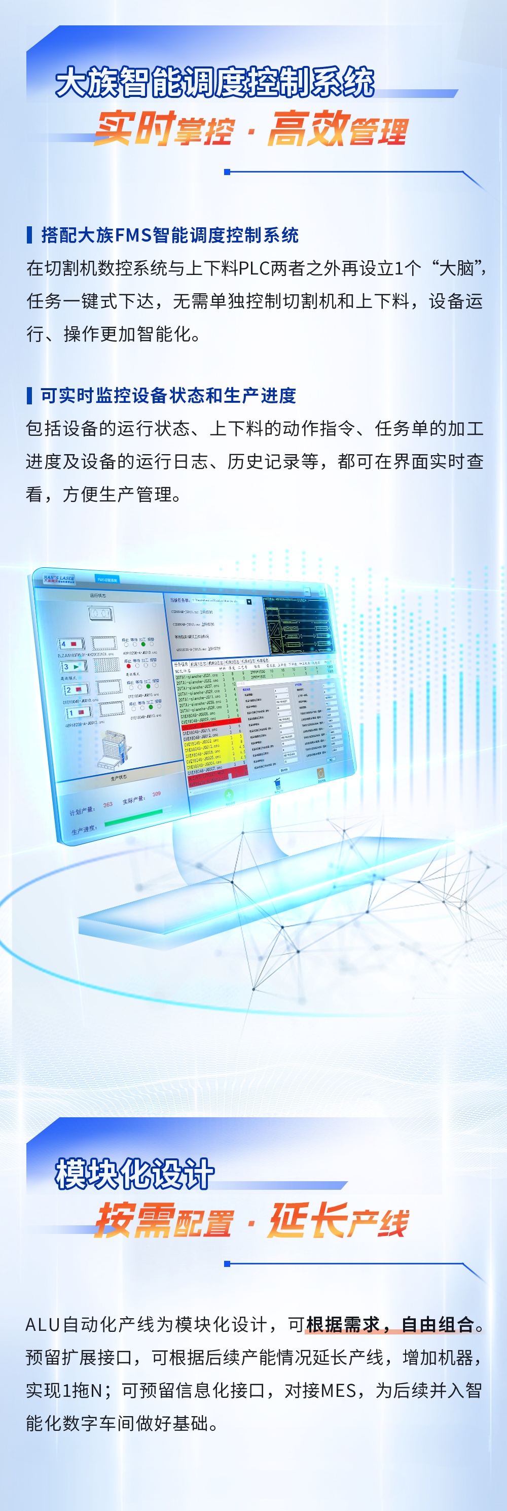 全新結(jié)構(gòu)的ALU系列自動化切割生產(chǎn)線,協(xié)調(diào)性更高、效率更高,模塊化設(shè)計,可根據(jù)需求自由組合,預(yù)留擴展接口,可根據(jù)后續(xù)實際產(chǎn)能情況增加機器,實現(xiàn)1拖N,并可預(yù)留信息化接口,對接MES,為后續(xù)并入智能化數(shù)字車間做好基礎(chǔ)。